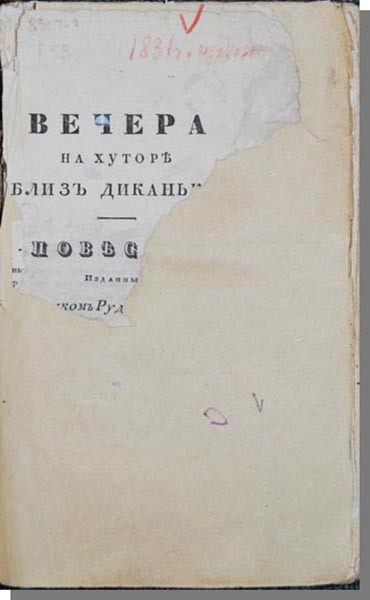 Вечера на хуторѣ близъ Диканьки : повести, изданныя пасичникомъ Рудымъ Панькомъ. / Н.В. Гоголь. - Санкт-Петербург, 1831. - 244 с. – Содержание : Сорочинская ярмарка ; Вечеръ наканунѣ Ивана Купалы ; Майская ночь, или Утопленница ; Пропавшая грамота.
